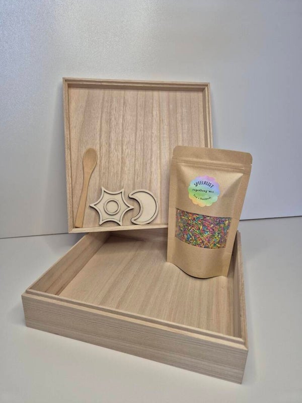 Speelbak: Een houten vierkante bak (23,7 x 23,7 cm) waarin kinderen de speelrijst kunnen verplaatsen, vormen en hun creativiteit de vrije loop kunnen laten. De bak is ideaal voor zowel individueel als gezamenlijk spel.